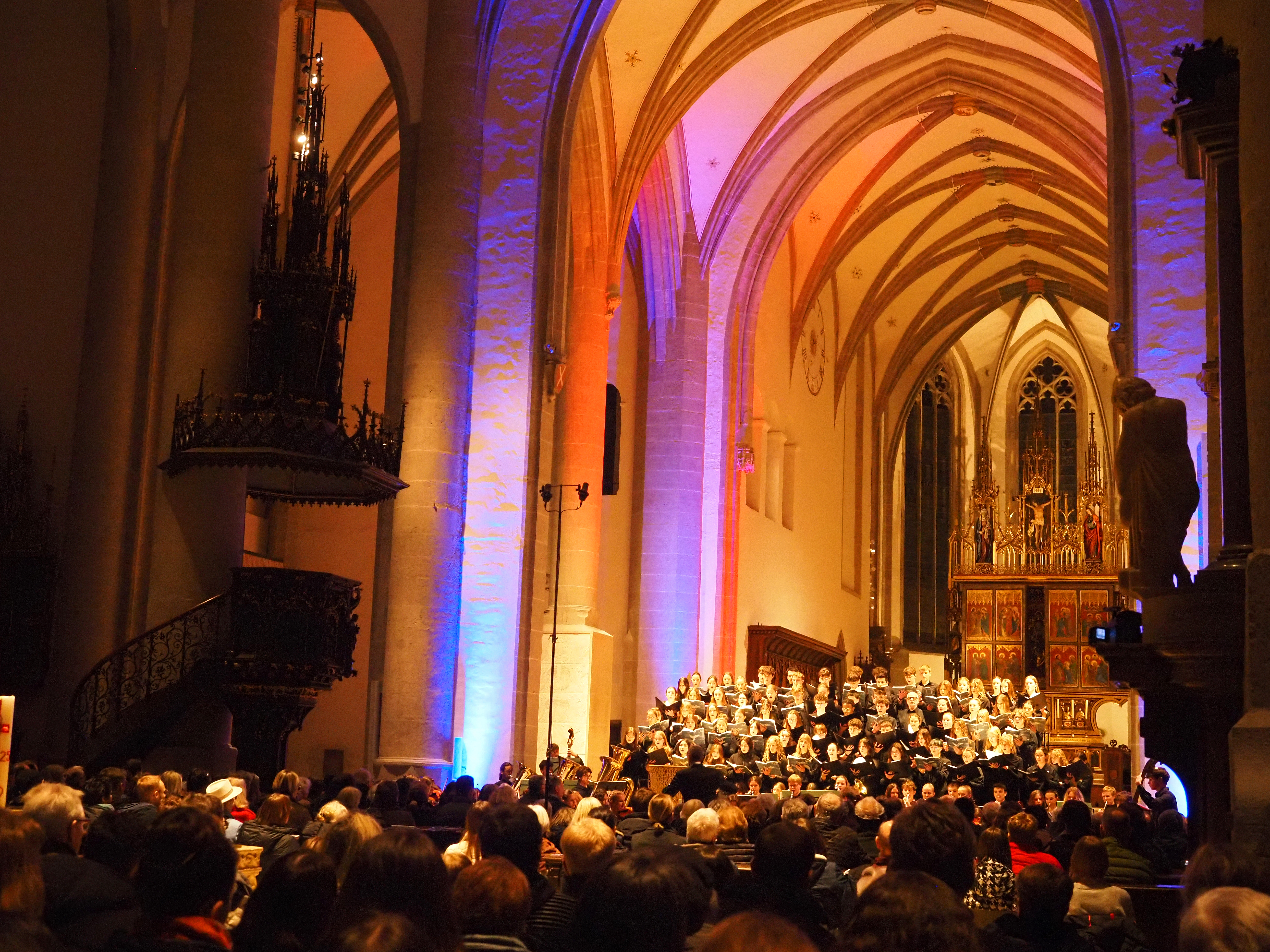 "52 französische Sänger der Maîtrise de la Loire, 30 deutsche Sänger und 45 deutsche Instrumentalisten des GG treffen sich zu einer gemeinsamen Probenwoche in Eichstätt unter der Leitung von Jean-Baptiste Bertrand, Michael Beck und Dominik Harrer mit dem Ziel einer gemeinsamen Aufführung… ein gewagtes Unternehmen mit einem gelungenen Ausgang: ein bewegendes, mitreißendes Konzert in der restlos gefüllten Aula, das noch lange in Erinnerung bleiben wird. Schlüssel für den Erfolg war zum einen die Musik, aber auch das Zusammensein – alle französischen Schüler waren in Familien untergebracht – und die gemeinsame Arbeit, bei der sofort der Funke übergesprungen ist. Eine Stadtführung in Eichstätt und ein Ausflug nach Nürnberg, wo unter anderem die Erlebniswelt von Lebkuchen Schmidt besucht wurde, rundeten die Woche ab. Begeistert, aber auch traurig reisten die Franzosen nach einer Woche wieder ab und alle freuen sie auf die Fortsetzung dieser Partnerschaft mit dem Gegenbesuch der Schüler des GG in Montbrison im März 2020."