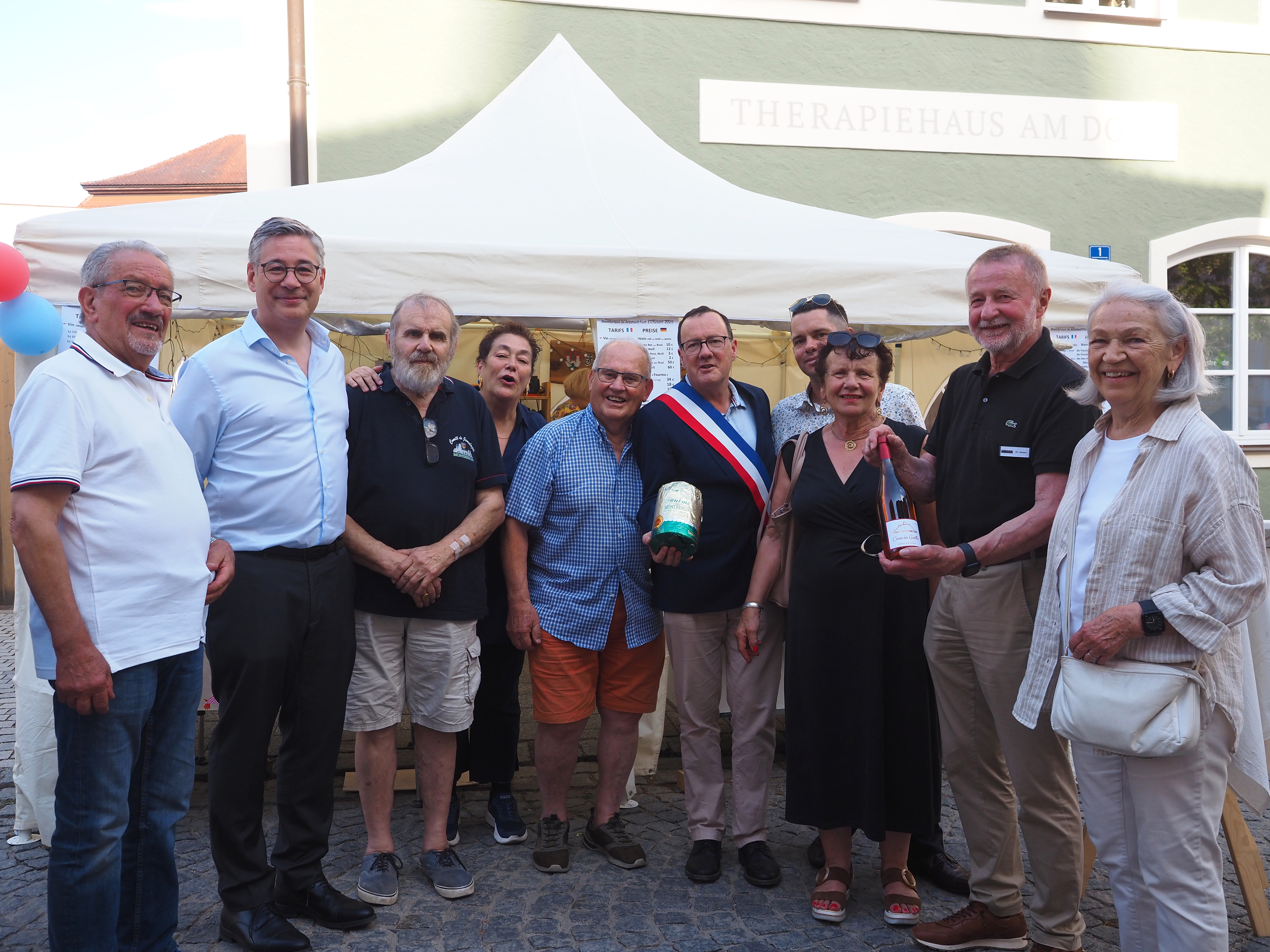 Traditionell kam auch heuer wieder eine Delegation unserer Freunde aus Montbrison zum Altstadtfest, um dort Wein, Käse und Saucisson zu verkaufen. Die deutschen Vereinsmitglieder des betreuten zusammen mit den Franzosen den Stand. So konnten die Eichstätter wieder bei ausgelassener Stimmung und traumhaftem Wetter in das französische savoir vivre eintauchen. Ein Highlight war dieses Jahr zum einen der Besuch des Generalkonsuls Alexandre Vulic aus München, der die Ehre hatte den Bieranstich zur Eröffnung des Altstadtfestes zu übernehmen, und natürlich zum anderen der des Bürgermeisters von Montbrison, Christophe Bazile, der in Begleitung seines directeur général des services, Thomas Callewaert, nach Eichstätt kam. Beide wurden offiziell von der Stadt Eichstätt begrüßt und erhielten als Gastgeschenk eine Lithografie mit dem Stadtbild. Natürlich stand auch für beide eine Führung im Rathaus mit einer Turmbesteigung auf dem Programm. Die Gäste aus Montbrison bekamen außerdem eine Stadtführung von Vereinsmitglied Ulrich Heider samt Domorgelkonzert. Auf Seiten der Montbrisonais war auch der Organister der Collégiale mitgereist, der im Mai zusammen mit dem Eichstätter Organisten, Martin Bernreuther, ein Konzert gespielt hatte. Nun konnte er auch die Eichstätter Orgel bespielen und war sichtlich begeistert. So stand das Altstadtfest auch heuer wieder bei bester Stimmung im Zeichen der deutsch-französischen Freundschaft.