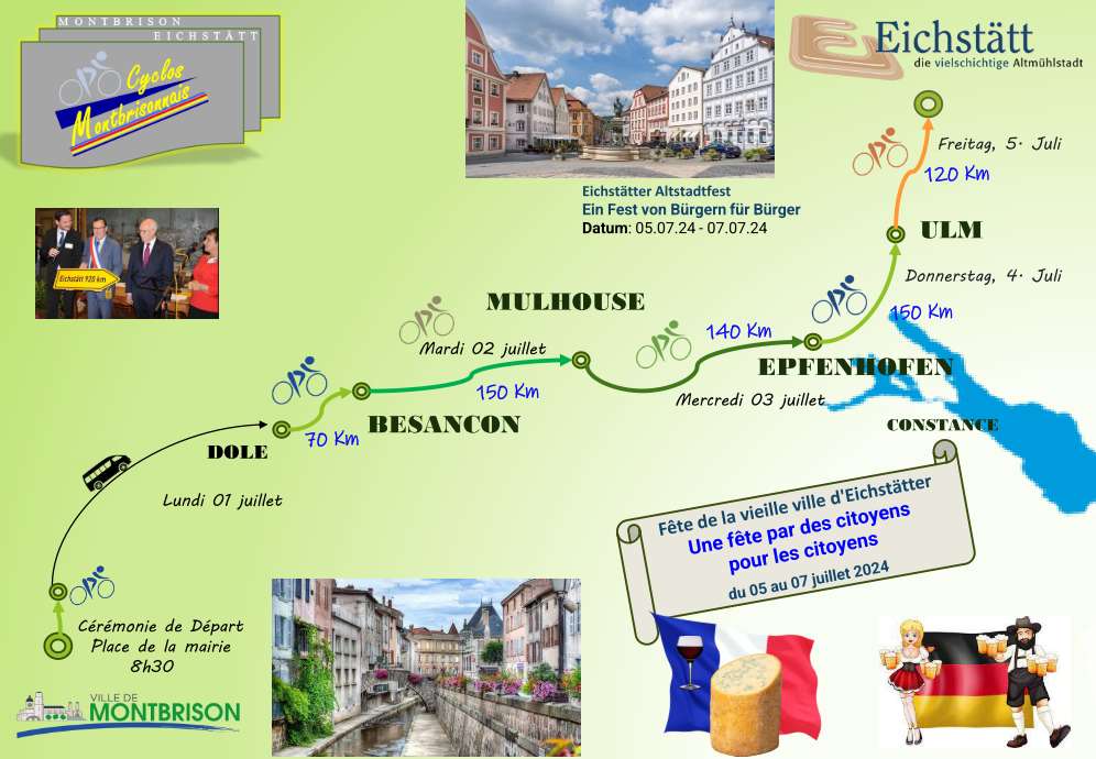 Außerdem sind zur gleichen Zeit Radler aus Montbrison (eine Gruppe von 13 Personen - Radler & Begleitfahrzeug) in Eichstätt. Sie planen die Ankunft in Eichstätt am Freitag 5. Juli gegen 15 Uhr, kurz vor der Eröffnung des Altstadtfestes. In Empfang genommen werden die französischen Radler auf etwa halber Strecke von DAV-Radlern, mit denen dann der letze Teil der Strecke gefahren wird. Wer sich hier anschließen möchte, oder auf eigene Faust den Radlern entgegenfahren möchte, kann dies gerne tun. Für den Samstag ist eine kleine Radtour, ein Empfang durch den Oberbürgermeister und eine Stadtführung vorgesehen. Und natürlich werden die Radler auch das Altstadtfest genießen.