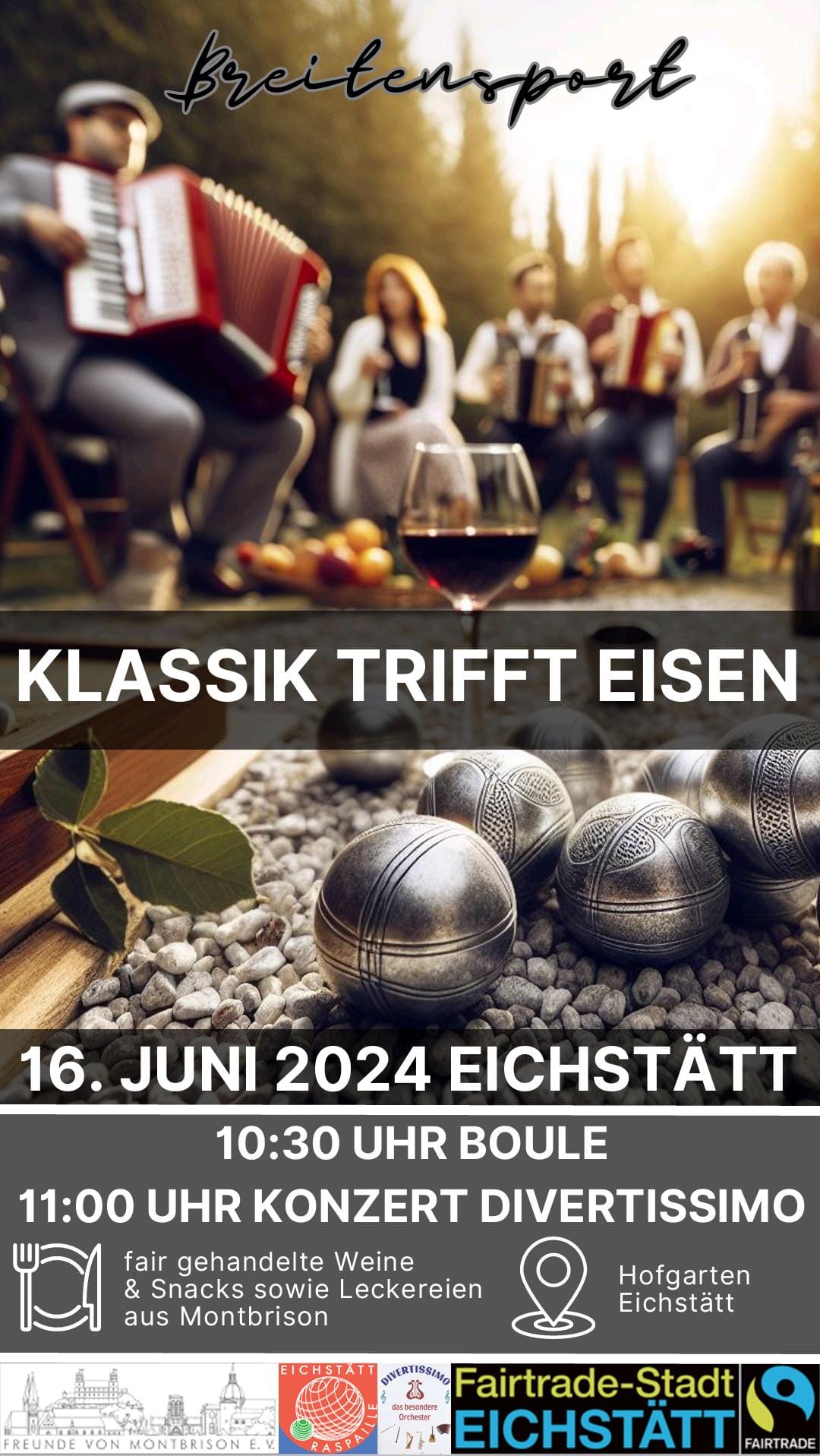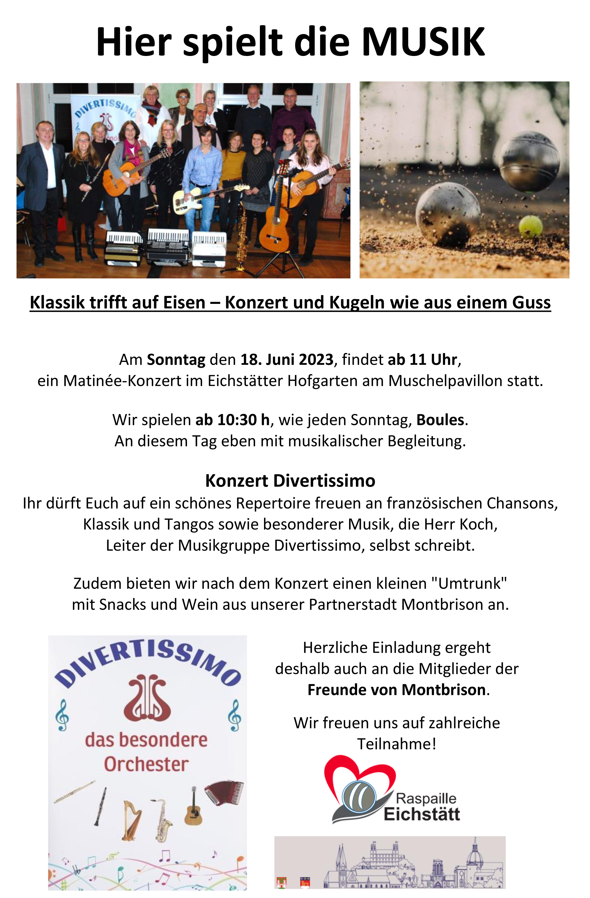 Unter dem Motto „Klassik trifft auf Eisen – Konzert und Kugeln wie aus einem Guss“ steht eine Veranstaltung am Sonntag, 16. Juni, im Eichstätter Hofgarten. Die Instrumentalgruppe Divertissimo, die Freunde von Montbrison und die Boule-Gruppe Raspaille Eichstätt bieten ab 11 Uhr ein Matinée- Konzert am Muschelpavillon an. Während des traditionellen offenen Boule-Spiels der Spielgemeinschaft Raspaille, die sich wie jeden Sonntag ab 10.30 Uhr im Hofgarten trifft, präsentiert die rund 15-köpfige Musikgruppe Divertissimo unter Leitung von Alexander Koch passende französische Chansons, Walzer, aber auch ein buntes Repertoire an Tangos, Klassik und Evergreens. Der Eintritt zum Konzert ist frei. Im Rahmen des diesjährigen zehnjährigen Jubiläums der Fairtrade- Stadt Eichstätt gibt es faire Getränke und Snacks sowie Wein aus Eichstätts Partnerstadt Montbrison
