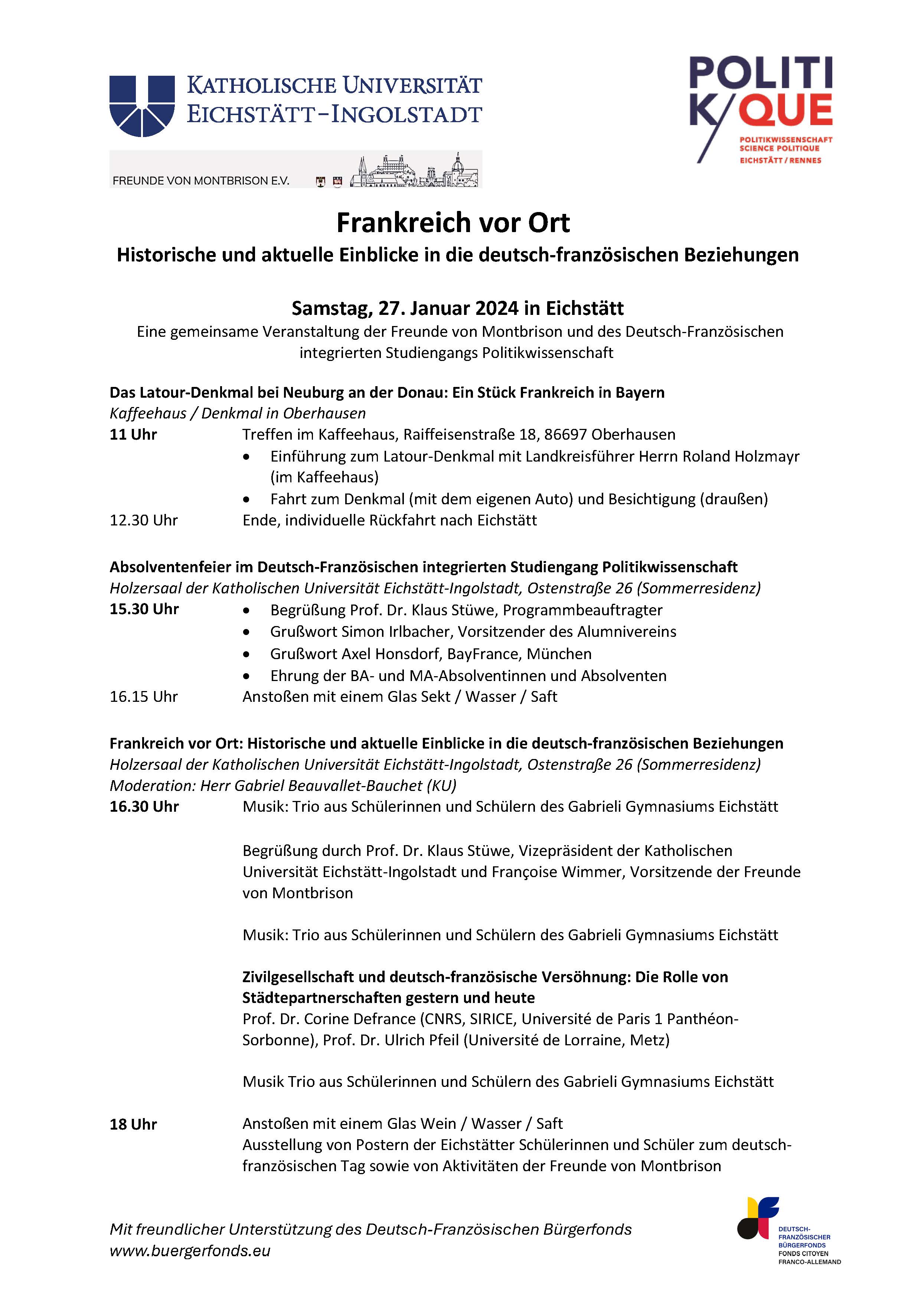 Auch heuer begeht der Lehrstuhl für Vergleichende Politikwissenschaft an der Katholischen Universität Eichstätt-Ingolstadt den deutsch-französischen Tag unter dem Motto „Frankreich vor Ort“ zusammen mit unserem Verein "Freunde von Montbrison" am Samstag, dem 27. Januar. Am Vormittag findet zunächst um 11 Uhr in Oberhausen eine Einführung zum Latour-Denkmal statt, dieses wird dann im Anschluss vor Ort besichtigt. Am Spätnachmittag ab 16.30 Uhr ergeht herzliche Einladung zur Veranstaltung im Holzersaal der Katholischen Universität zum Thema "Frankreich vor Ort: Historische und aktuelle Einblicke in die deutsch-französischen Beziehungen“. Um Anmeldung wird für die beiden Termine gebeten, am besten direkt bei Frau Dr. Christina Rüther: christina.ruether@ku.de Wir freuen uns auf euer zahlreiches Kommen!