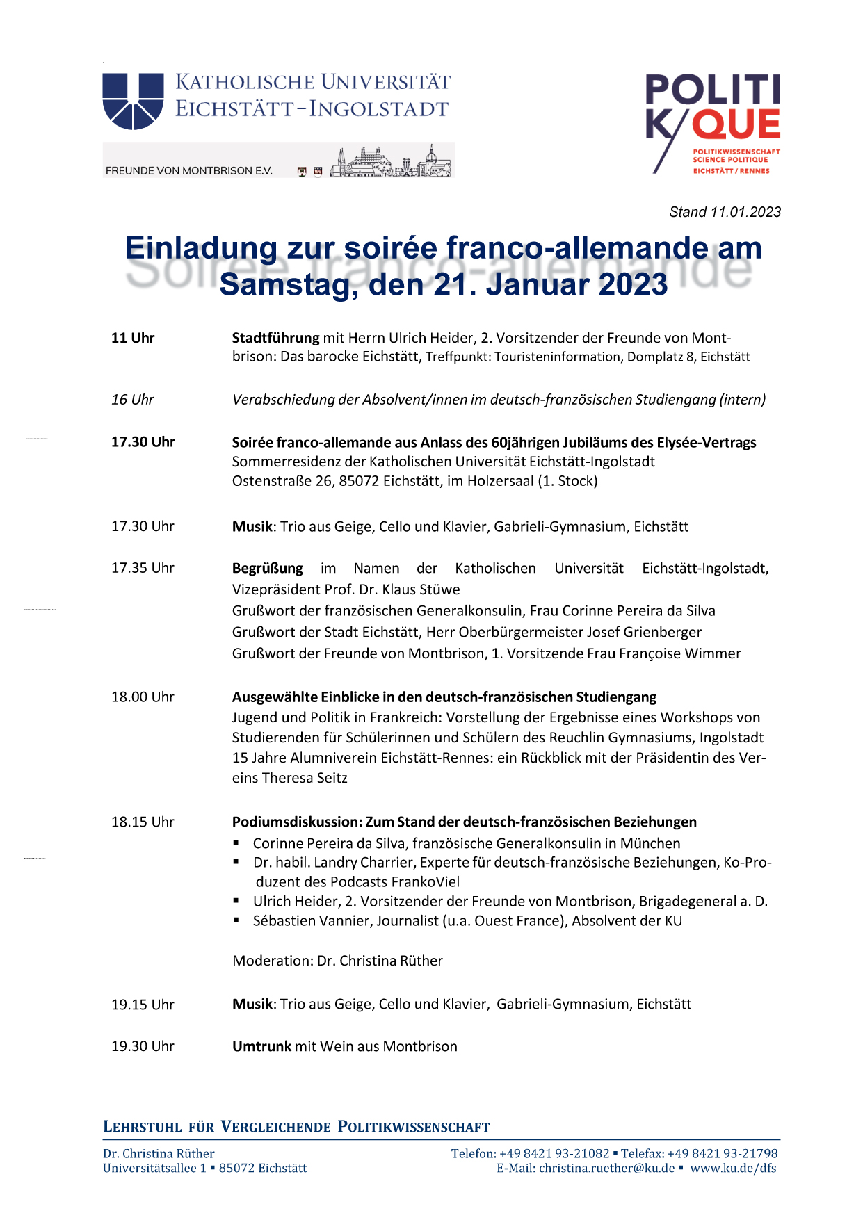 Am 22. Januar jährt sich die Unterzeichnung des Elysée- Vertrags zum 60. Mal. Dieser Vertrag, den Charles de Gaulle und Konrad Adenauer am 22. Januar 1963 unterzeichneten, gilt bis heute als Fundament der deutsch-französischen Freundschaft. Deshalb möchte der Lehrstuhl für Vergleichende Politikwissenschaft an der katholischen Universität Eichstätt-Ingolstadt dieses Jubiläum zusammen mit dem Verein "Freunde von Montbrison" am Samstag, den 21. Januar, um 17.30 Uhr feierlich mit einer soirée franco-allemande, einem Deutsch-Franzsösichen-Abend, begehen. Es freut uns besonders, dass auch die französische Generalkonsulin ihre Teilnahme zugesagt hat.